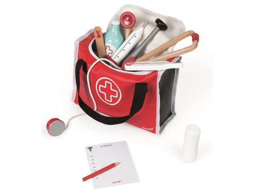 Contains: A syringe equipped with an inner spring, a hammer for reflexes, a bottle of disinfectant, a stethoscope, an otoscope equipped with a magnifying glass, a thermometer, a tab, a prescription notebook (30 pages). ) with a pencil of paper and a roll of bandage.