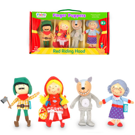 A fabulous finger puppet set from Fiesta Crafts including Red Riding Hood, Grandma, the Wolf and the Woodcutter.  This traditional hand puppet set is great for imaginative play and story telling.