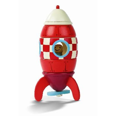 This cherry wood rocket features five stackable layers that little ones will enjoy putting together to assemble their own rocket ship, guided and aided by the magnetic locators that have been placed around the individual, easy to handle pieces. Don't forget your happy astronaut friend or the spinning propeller at the bottom of the rocket as it won't reach outer space without them!