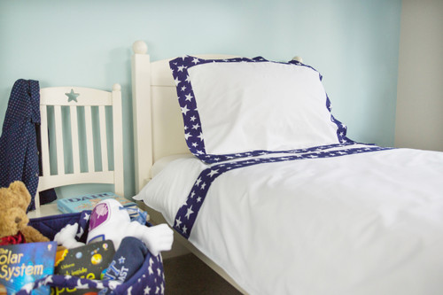 We love the fresh and clean design of this bedding set which features a duvet cover with one side in an ‘all over’ navy blue star design, whilst the other side and the Oxford pillowcase are in plain white with the star design detail adding a finishing touch.