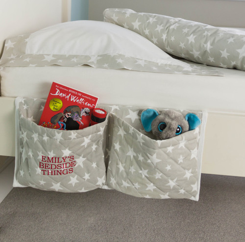 Our Kiddiewinkles grey star bedside organiser is made from 100% quilted cotton and features two generous sized pockets each measuring 25cm wide x 20cm high.