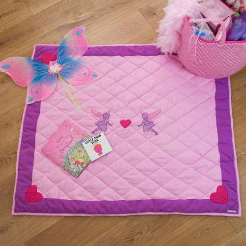 This Fairy and Heart floor quilt from Kiddiewinkles is designed to fit the large Kiddiewinkles Fairy play house perfectly and can also be used on its own as a play mat. Made from 100% cotton with a 100% quilted polyester filling, the Fairy and Heart Floor Quilt features 2 beautiful hand embroidered and appliquéd fairies complete with silver sparkling fairy wings, and 5 pink hearts on the one side and a plain light pink fabric on the reverse.