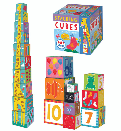 These 10 piece Stacking Cubes from Foot Steps are a great stacking toy for toddlers. The cubes can be built into a wonderfully tall tower to help young children with sequencing as well as sorting by size; they can also be lined up horizontally to show a lovely jungle scene with different animals on each cube
