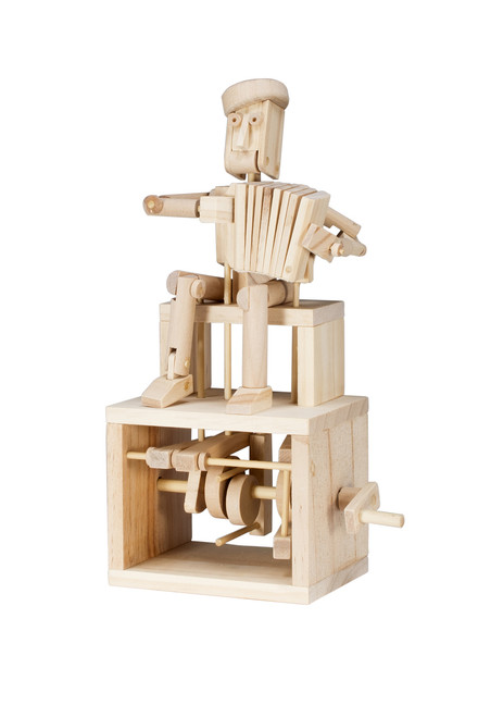 Watch in delight as the accordion player you put together with your child as part of the TimberKits Accordion Wooden Model Kit plays, sings and taps his foot. Even better, it is your clever construction that makes the magic work (that and the wooden cams, levers and more that made up the mechanical part of the design).