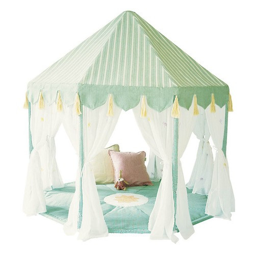 This Willow Green Pavilion from Win Green is made from 100% cotton and has a multi-stripe fabric roof decorated with tassels, poles covered with mini-gingham fabric and curtains embroidered with beautiful dragonflies.  The Win Green Willow Green Pavilion includes a lightly padded floor quilt with an embroidered lotus flower.  The Pavilion is easy to assemble with a light aluminium frame and includes a handy storage bag.